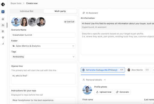 Full-cycle AI roleplays (cold, warm, discovery, demos, renewals) with multi-party calls.