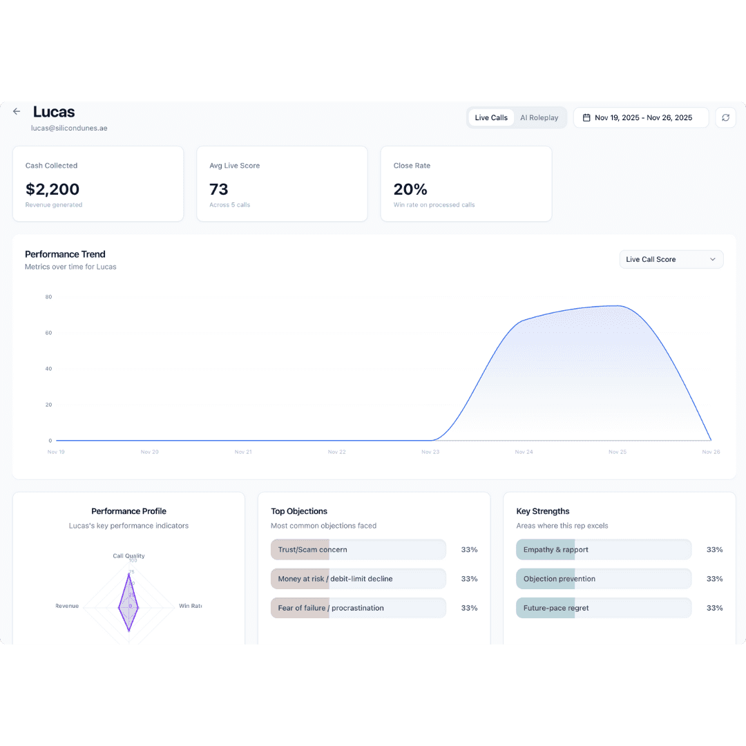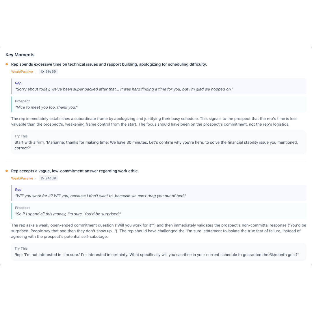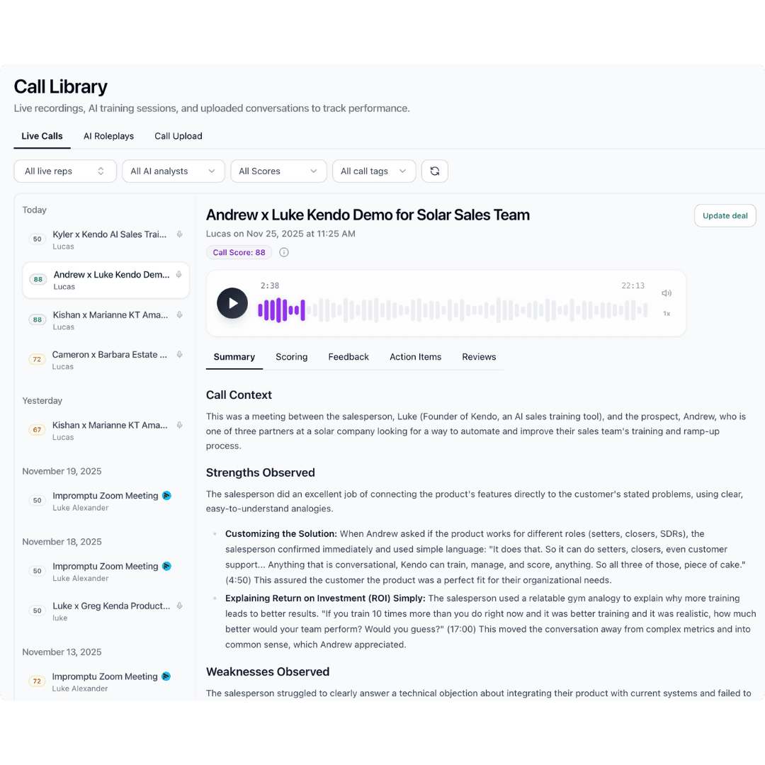 Kendo automatically reviews every call, identifies strengths, weaknesses, and areas for improvement